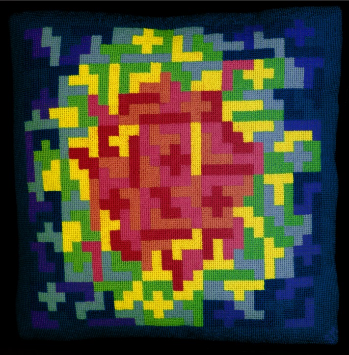 This is my very first needlepoint. It won a blue ribbon for original design at a Marin County show. My IMSAI 8080 kit computer solved the pentomino puzzles, but the overall design was done using little squares of paper on a greased up board. After this project, I was very busy in my career, and did not do another needlepoint for 13 years.